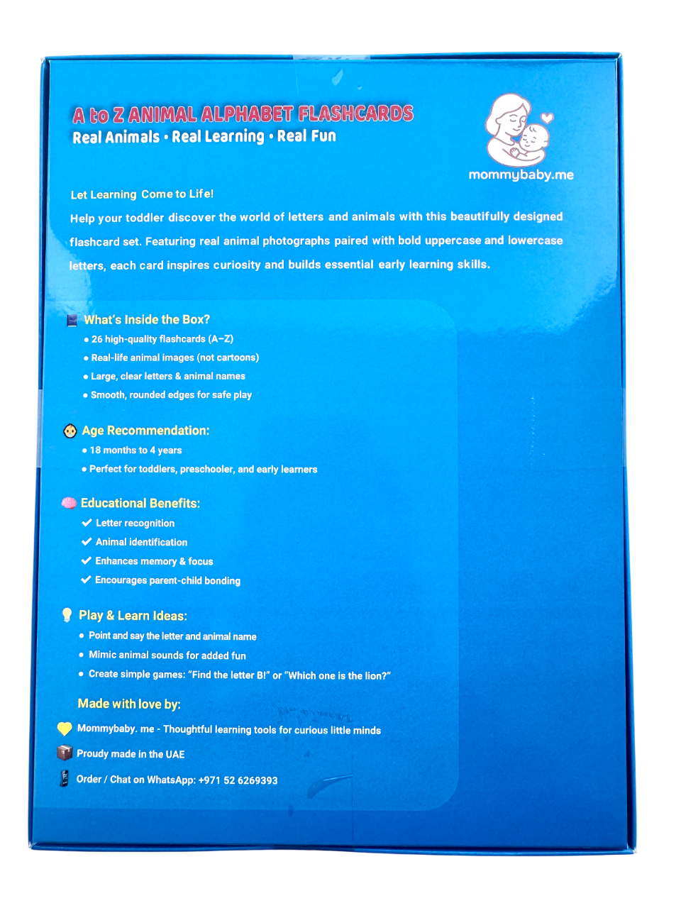 Large A5 Animal & Alphabet Flashcards – 26 high-quality, rounded-edge cards with real-life animal photos. Perfect educational learning tool for toddlers & preschool kids in the UAE. Durable, safe, and ideal for early childhood development.
